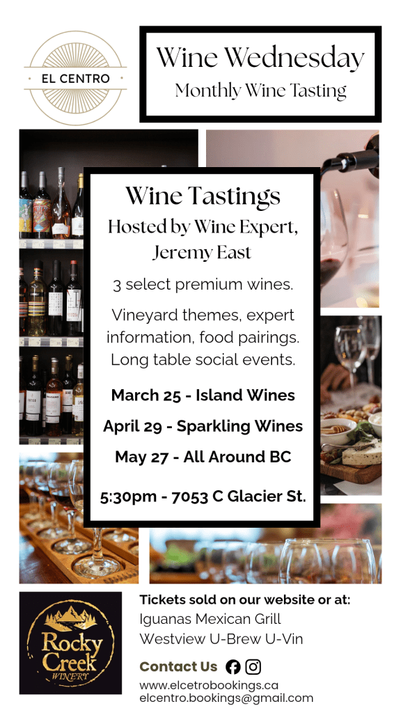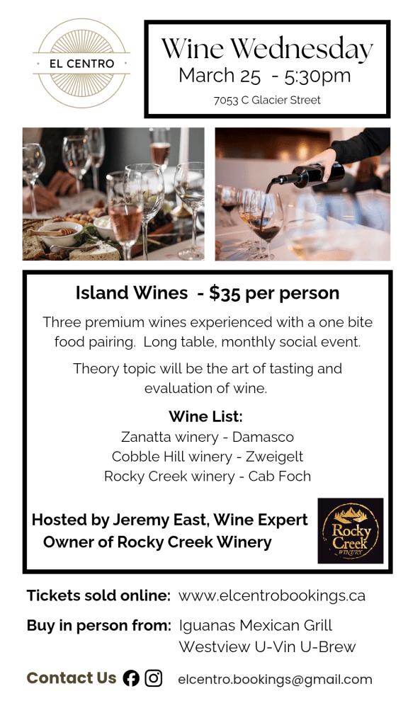 The March session focuses on Island Wines, showcasing selections from Vancouver Island wineries. The evening will also explore the art of tasting and evaluating wine, guided by wine expert Jeremy East, owner of Rocky Creek Winery.