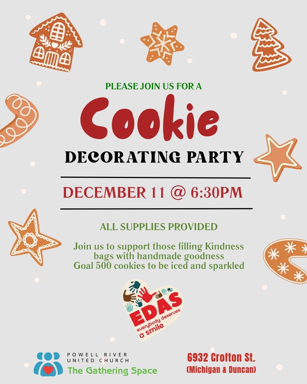 🍪 Christmas Cookie Decorating Party – Volunteers Needed! 🍪 We’re calling for volunteers to help decorate 500 Christmas cookies for our Kindness Bags project in partnership with Everybody Deserves a Smile (EDAS). All supplies are provided, and everyone is welcome to join in. Come add icing, sprinkles, and a little holiday magic as we share […] |