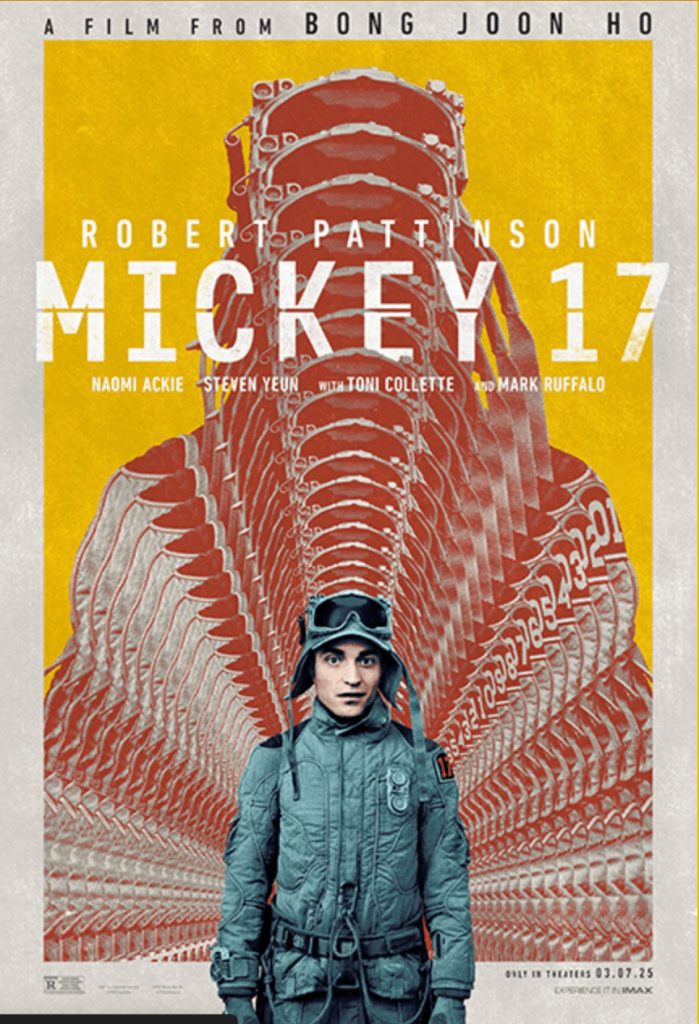 MICKEY 17, (Robert Pattinson) known as an “expendable,” goes on a dangerous journey to colonize an ice planet…MICKEY 17 finds director Bong Joon Ho (Parasite) returning to his forte of daffy sci-fi with a withering social critique at its core, proving along the way that you can never have too many Robert Pattisons.